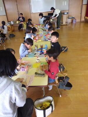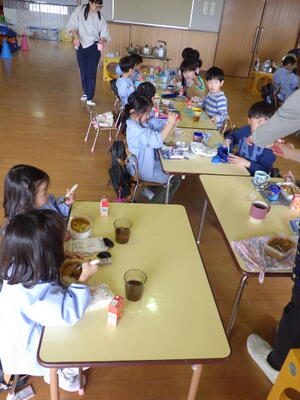 いよいよカレーパーティーです。遊戯室でみんなで一緒にカレーライスを食べました。おいしかったのでおかわりもしました。