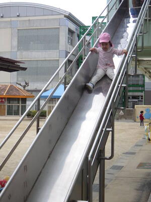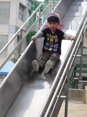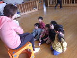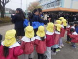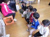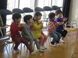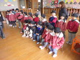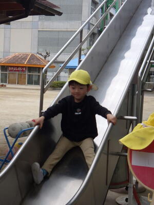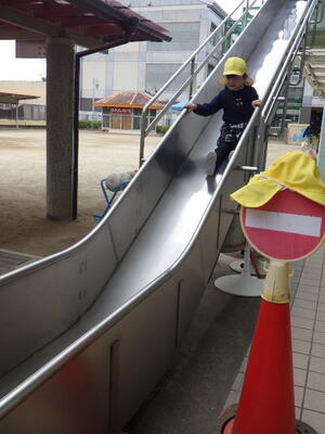 年少組の子どもたちは4月から2階のお部屋で過ごしますので万が一に備えて「非常用滑り台」を使って避難する練習をしました。年中組が手本を見せてくれました。落ち着いて真剣に避難しました。