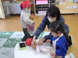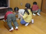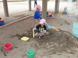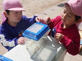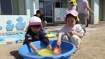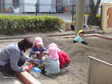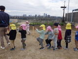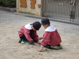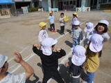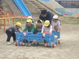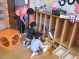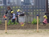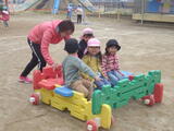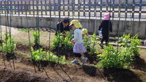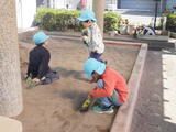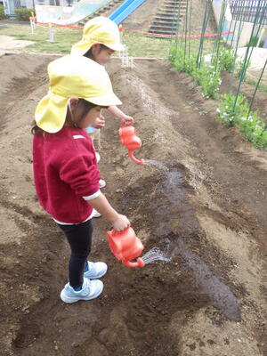 「いっしょに遊ぼう!」お部屋でも園庭でも年中組と年少組の子どもたちが一緒に遊んでいました。卒園した年長組のお兄さんお姉さんから引き継いだ畑のお世話も一緒にしました。