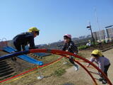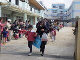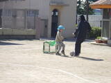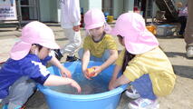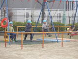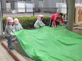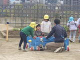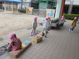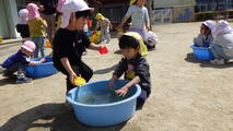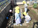 3学期もたくさん使った遊具をみんなで一緒に洗うことにしました。年中組の子どもたちが大きいものや少し重たいものを運んでくれます。洗い方や干し方の手本を見せてくれました。頼もしいです。