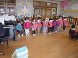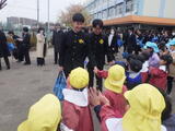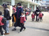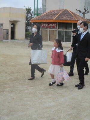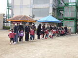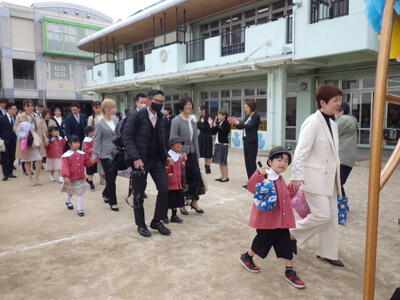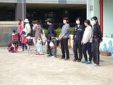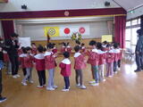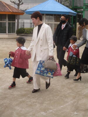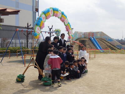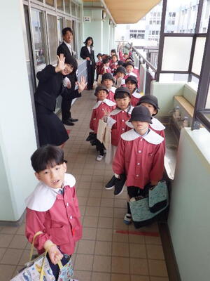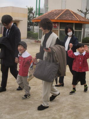 全員で過ごす最終日です。年中組と年少組の子どもたち、そして保護者の皆様に門出送りをしてもらいました。「卒園おめでとうございます。」
