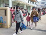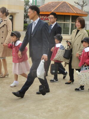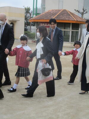 年少組の子どもたちが来賓の皆様の席で大きな拍手をして応援する中、年長組の子どもたちが入場してきました。卒園までに年長組のお兄さんお姉さんが登園する日はあと4日間です。