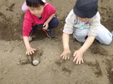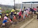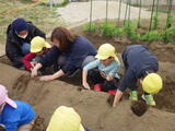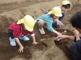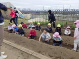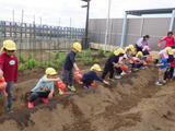 「畑のお世話をお願いします!」年長組のお兄さんお姉さんからバトンを引き継ぎました。今日はジャガイモの種芋を植えました。